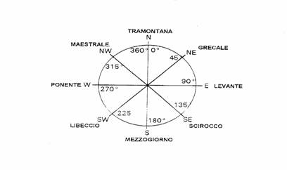 A seconda della direzione da cui proviene il vento, rispetto ai punti cardinali, esso prende nomi diversi : Nord o Tramontana, Nord-Est o Grecale, Est o Levante, Sud-Est o Scirocco, Sud o Mezzogiorno, Sud-Ovest o Libeccio, Ovest o Ponente e Nord-Ovest o Maestrale |