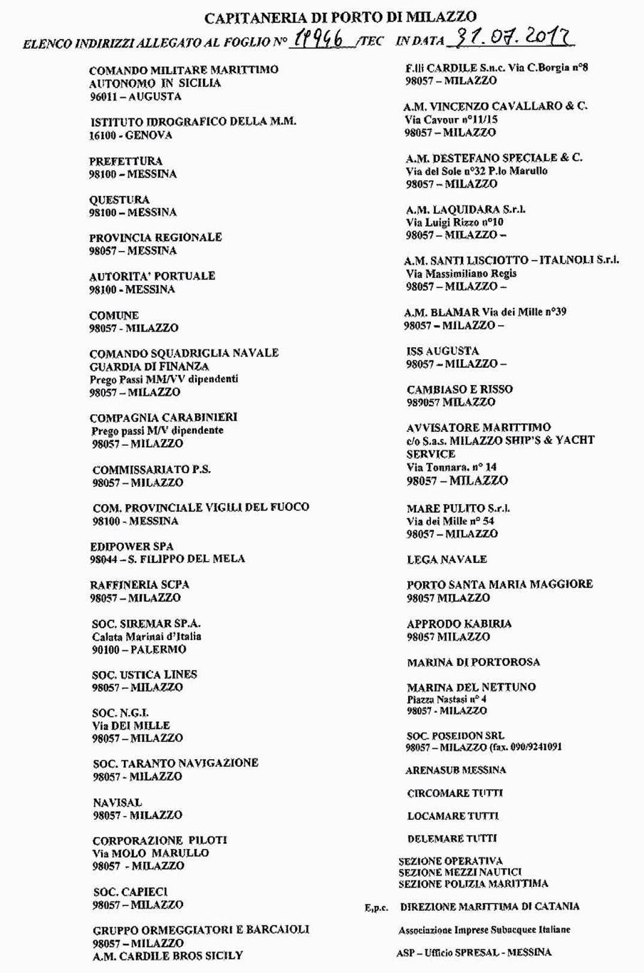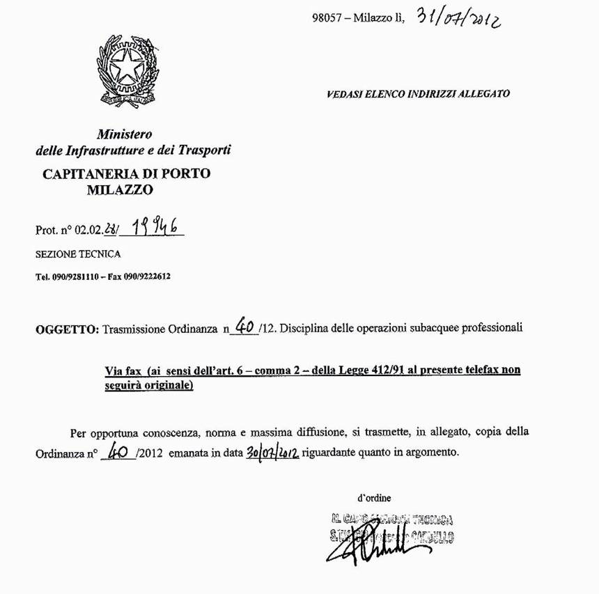 Tutti i sommozzatori partecipanti alle operazioni subacquee devono essere in possesso dell’iscrizione nel Registro dei Sommozzatori in Servizio Locale, di cui al Decreto dell’allora Ministero della Marina Mercantile del 13 gennaio 1979 e successive modifiche ed integrazioni, tenuto da questa Capitaneria di Porto, ovvero in possesso del nulla osta a svolgere temporaneamente la propria attività nel Circondario marittimo di Milazzo.