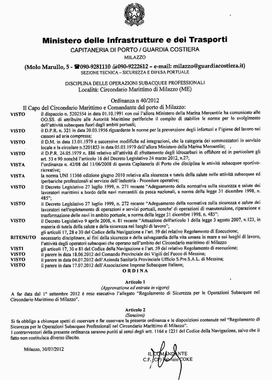 Il presente regolamento entra in vigore a far data dal 1° settembre 2012, volendo in tal modo uniformare tutte le modalità di esecuzione delle operazioni subacquee da espletarsi nel Circondario Marittimo di Milazzo.