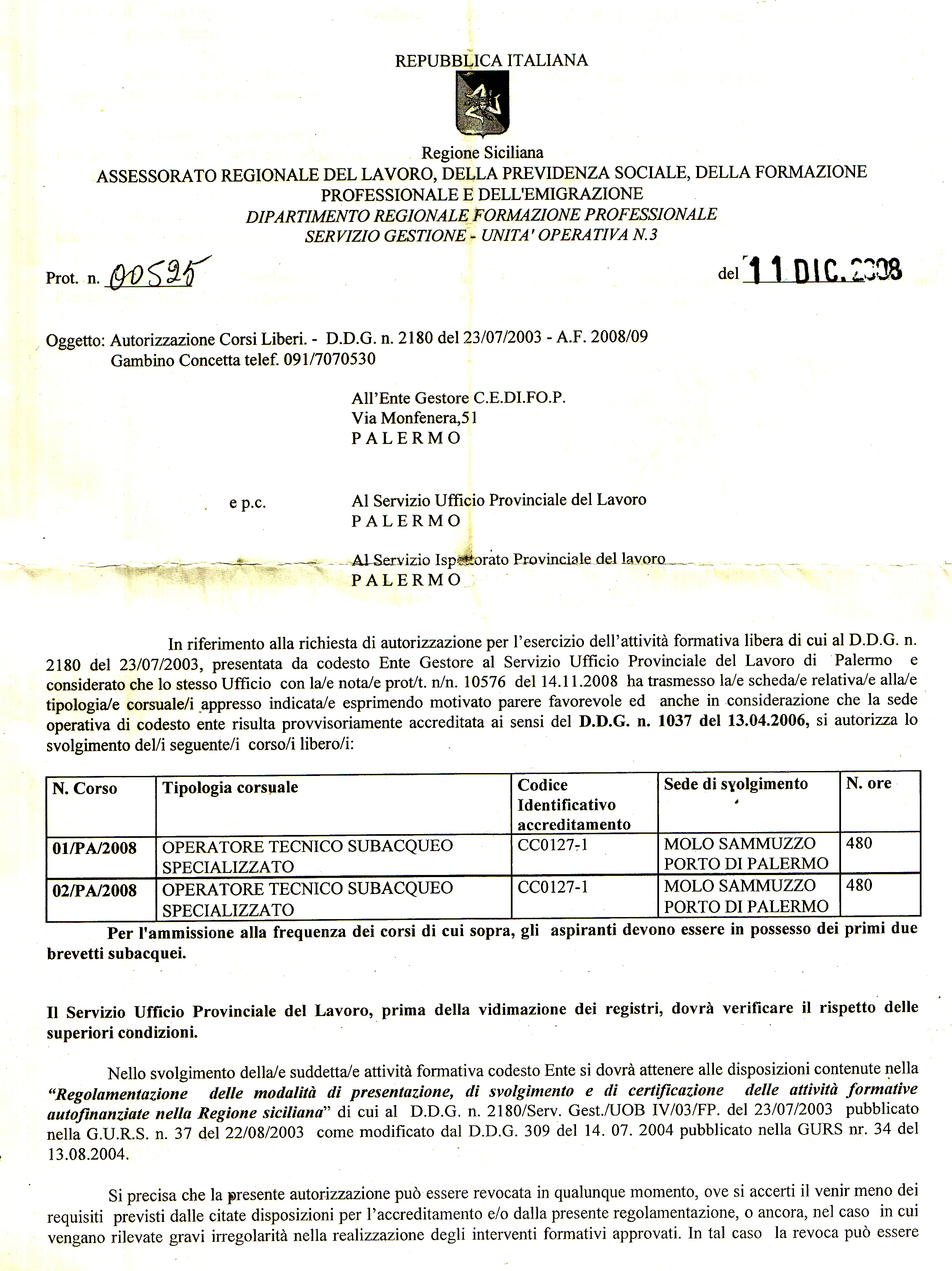 professionale di OPERATORE TECNICO SUBACQUEO SPECIALIZZATO,