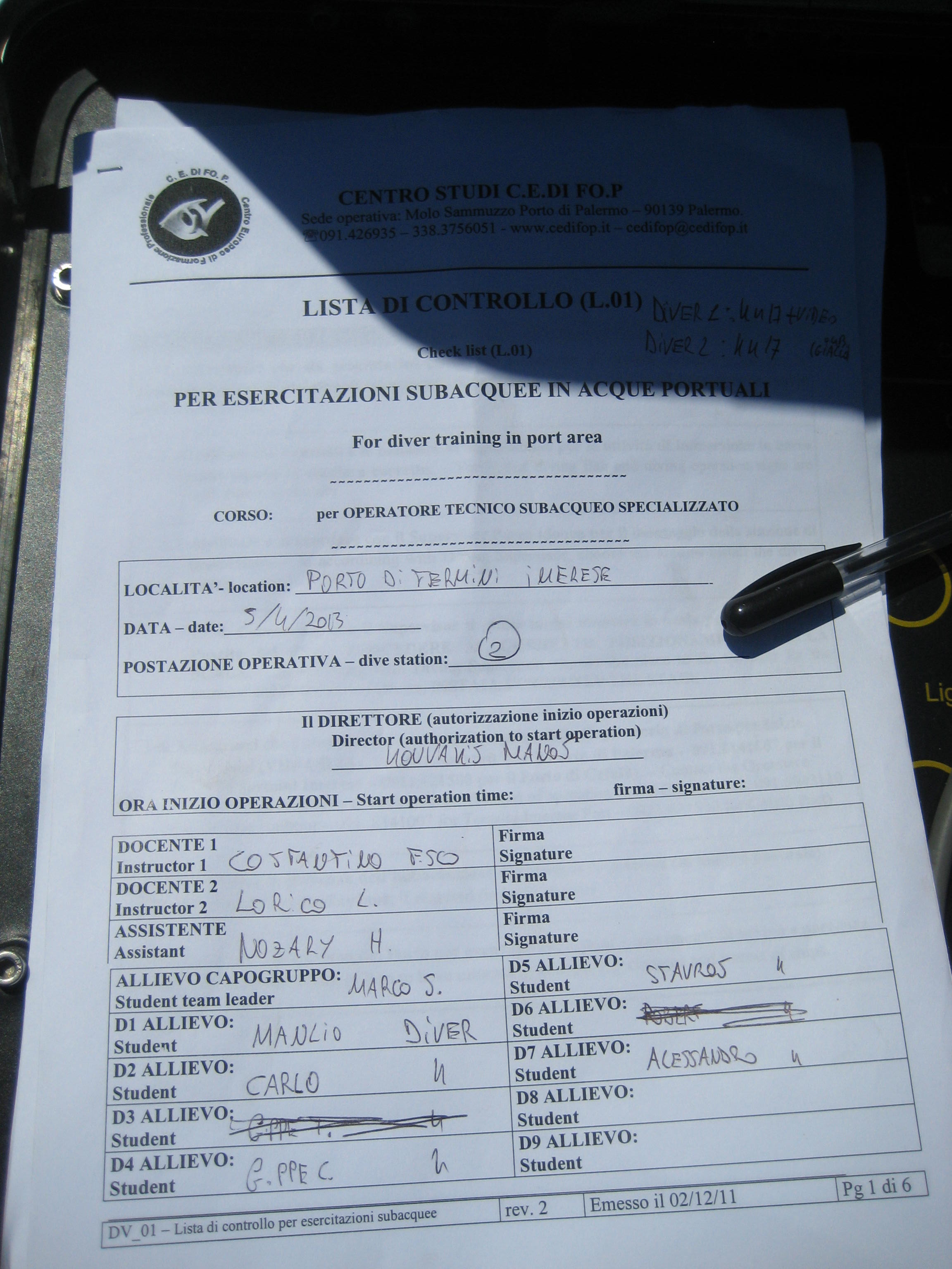 corso libero n.ro 01/PA/2013 per Operatore Tecnico Subacqueo Specializzato (PA)