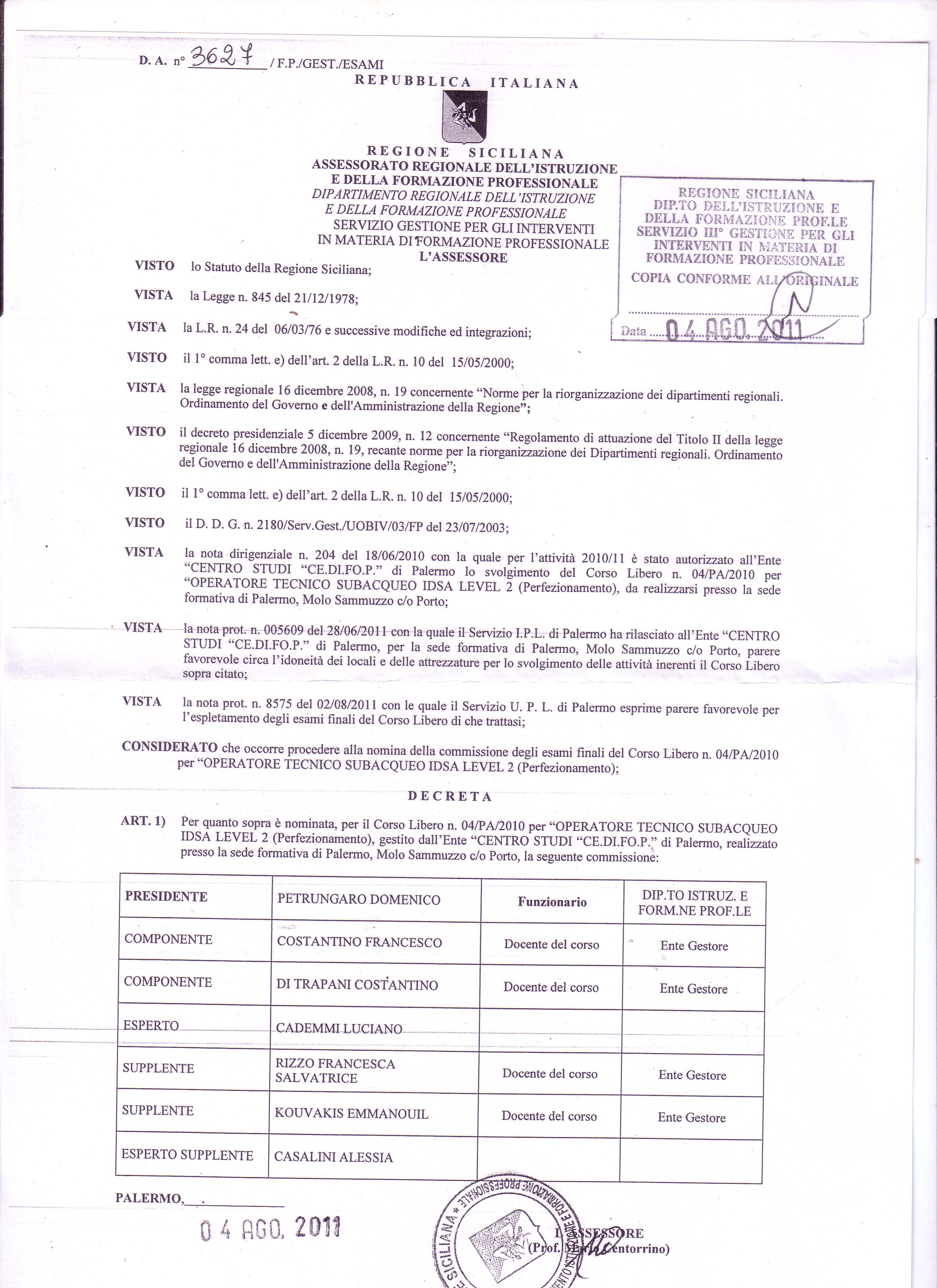 Decreto Assessoriale nomina commissione esami |