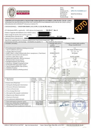 | brevetto Saldatore subacqueo rilasciato da BUREAU VERITAS | non indicati | mondiale | incluso | ||||