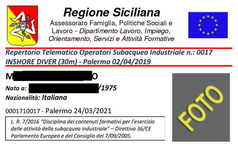 per il rilascio della CARD del "Commercial Diver Italiano" da parte dell'Assessorato al Lavoro per il livello INSHORE AIR DIVER