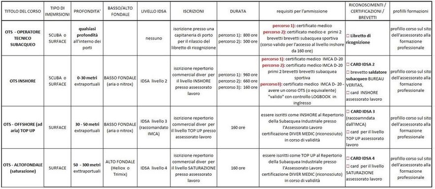| ISCRIZIONE presso una CAPITANERIA DI PORTO per il rilascio del "libretto di ricognizione"(parte OTS) | profindità immersioni: senza alcun limite di profondità purchè realizzare all'interno delle aree portuali (DM 13.01.1979) | validità ITALIA (DM 13/01/1979 e fuori italia solo per titoli simili - ambito portuale) | corso corso OTS 4.500 € | offerta CEDIFOP 5.300 € | |||
